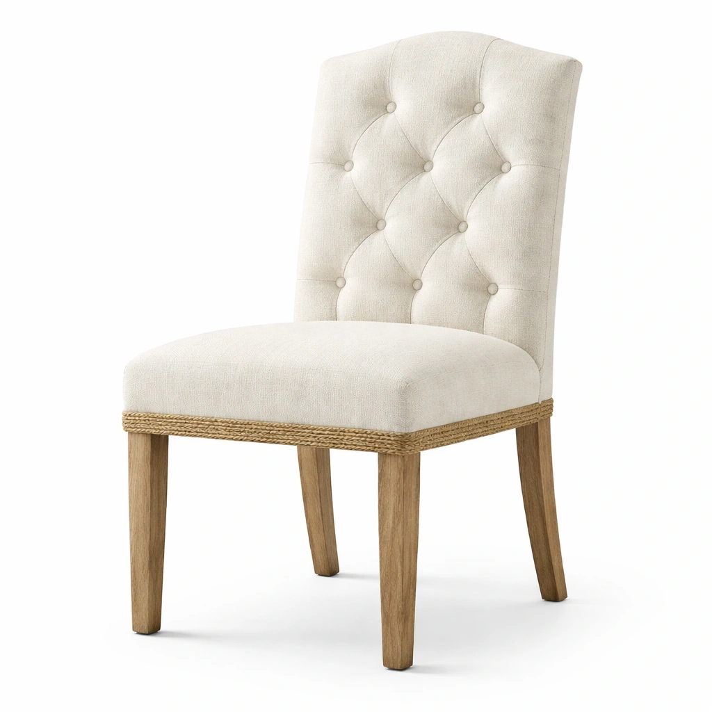 Material: Asiento de tela de poliéster, estructura de madera de roble, detalle de cuerda de yute